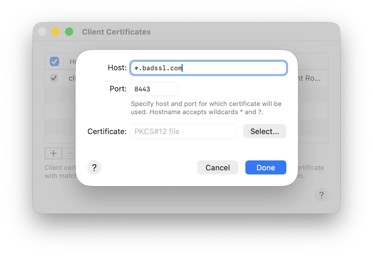 Select a PKCS#12 bundle file that contains a certificate and private key to use as client certificate to connect to remote servers. Enter the password for that PKCS#12 file. It will be imported Application Support folder in Proxygen app container for later use.