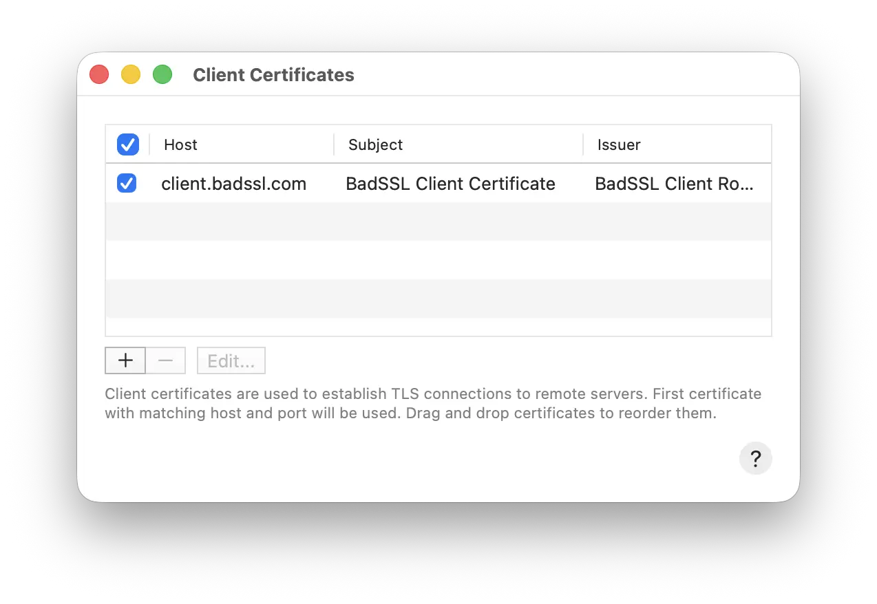 Note that the first matching client certificate will be used to authenticate to the remote server. Enable or disable client certificates using the checkbox. Drag to reorder certificates in the list.