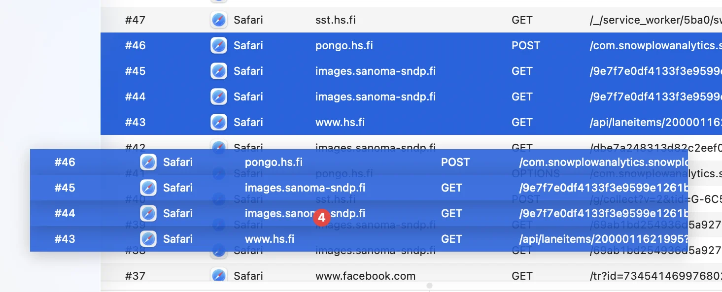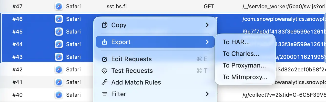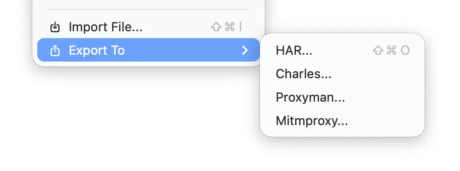 Under Export To select a file format to export all HTTP messages in the message history. The exported file can then be opened in another application. Keyboard shortcut shift-command-o opens the HAR export dialog directly.